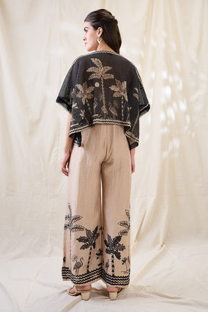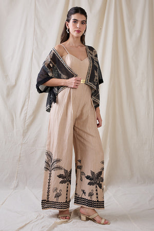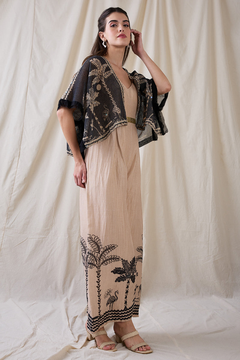Beige Noorani printed jumpsuit, paired with black embellished jacket in cotton net.