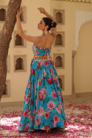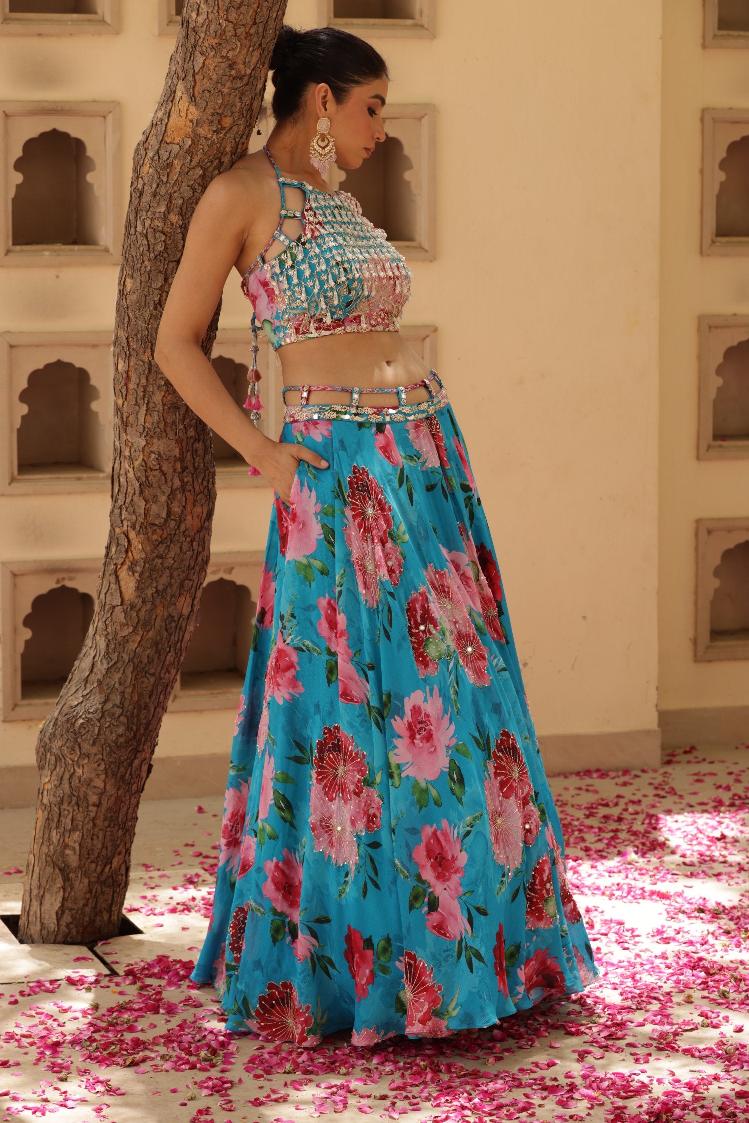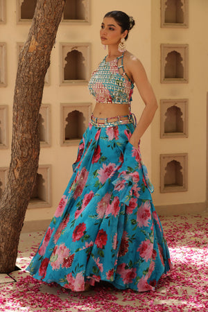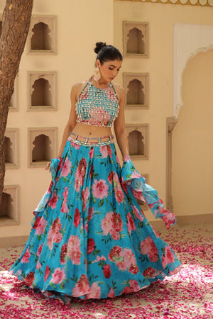 Feauting floral print box pleate lehenga with embroidered belt and loops, Braided dori for adjusting waist. Comes along with Halter neck blouse with hand emboidery and loops, Double ruffled dupatta. The whole set is in chinnon chiffon floral print