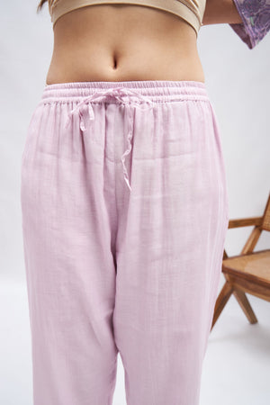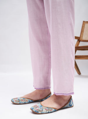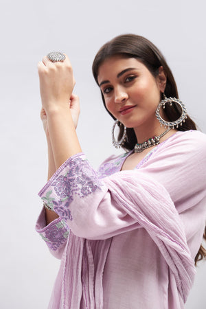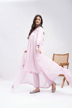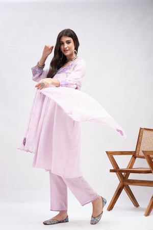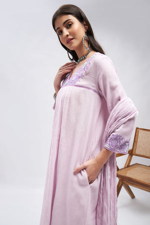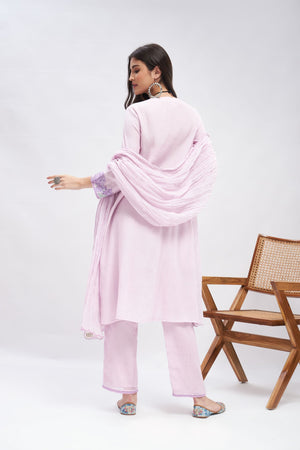 Lilac kurta set with tonal pants and dupatta. Lilac chanderi kurta set with tonal pants and dupatta. The kurta set comes with fine mulmul lining and beautiful floral motif embroidery.