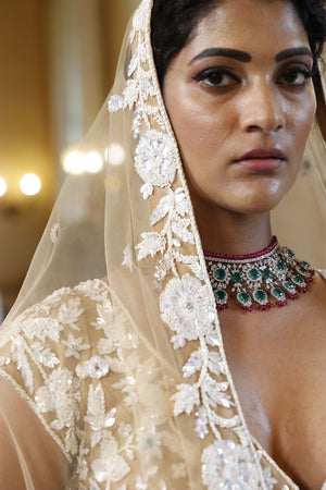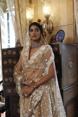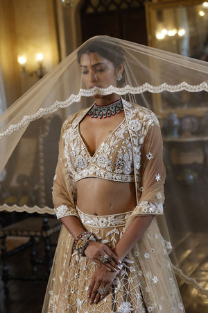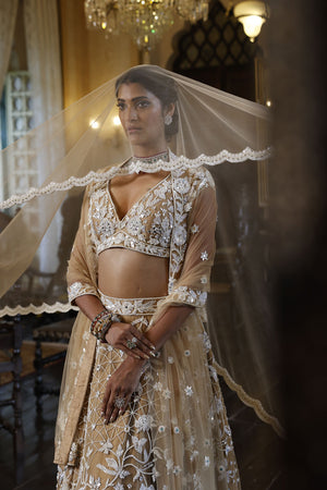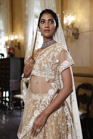 Lehenga: Nude net 24 kali lehenga with embroidery of kutdana, sequins, crystals and mirrors in abstract geometric and floral pattern all over | Choli : Nude net choli. It has leaf shape neckline, cap sleeves and tie-up at the back with tassels. It is embroidered with cutdana, sequins, crystals and mirrors in floral pattern all over with floral border at the hem | Dupatta : Nude net dupatta with embroidered floral border and flower buttis all over finished with tassels