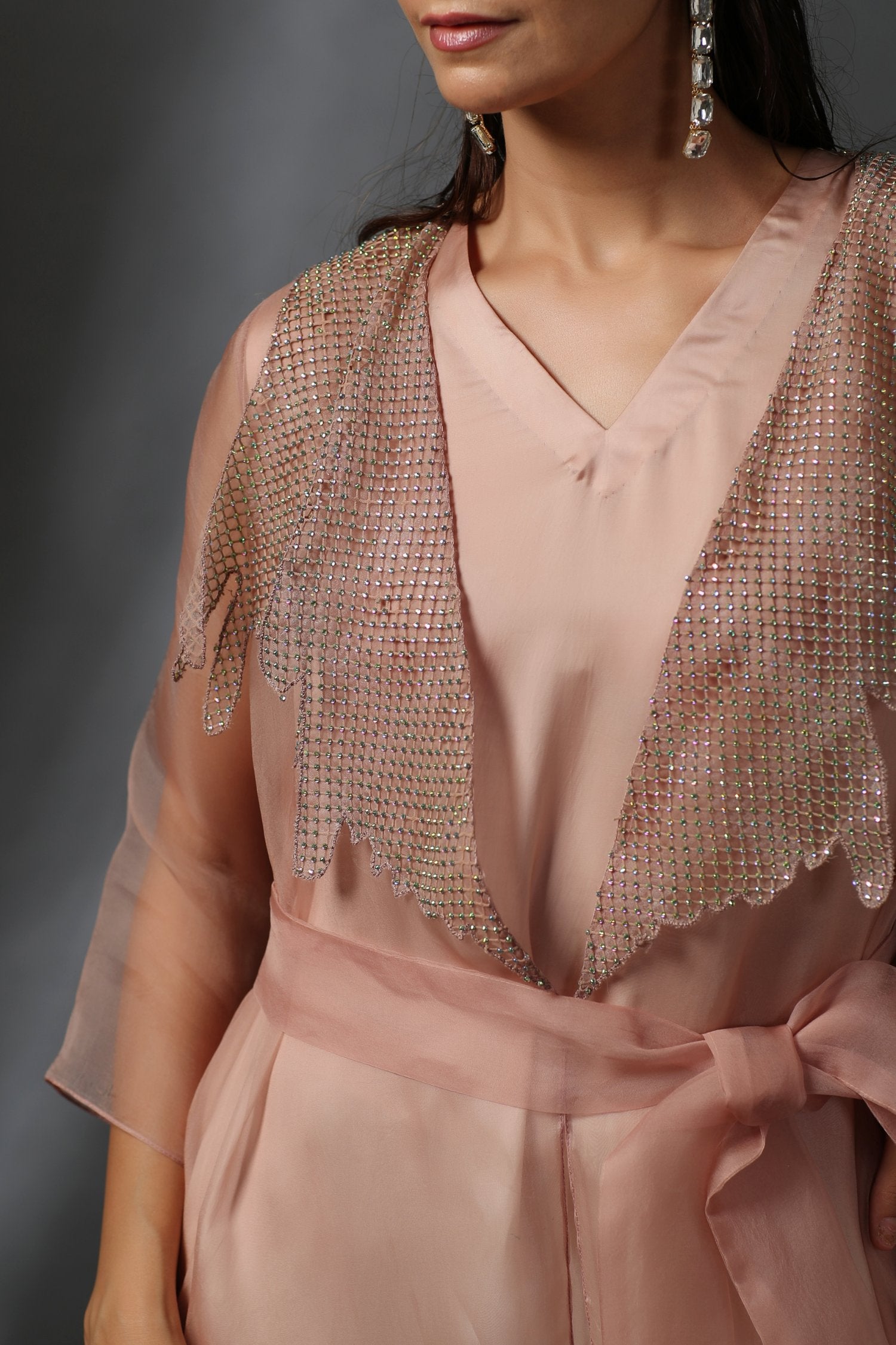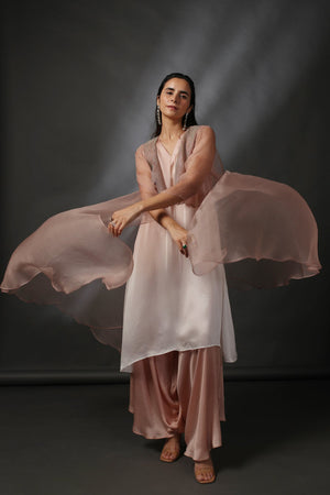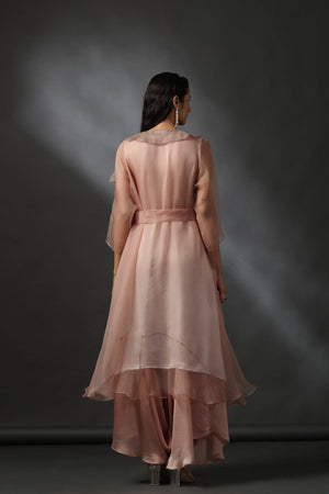 A delicate set that comes with a pure organza jacket with rhinestone embellished collar, an ombré dyed tunic and draped pants in the same color. An additional organza belt is provided for further styling.