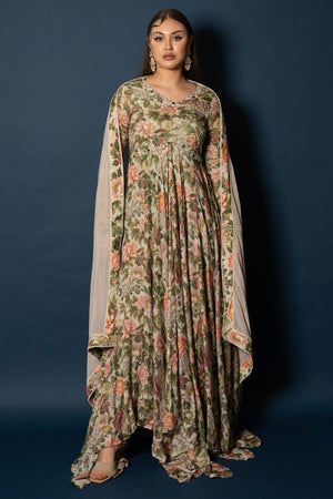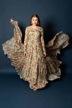 This royal vintage floral printed beauty is intricately embroidered with pearls , emerald green stones etc . The fabric is flowy and smooth, making it a dream to wear. And guess what? The flare of this Anarkali is more than 10 meters! Can you imagine the elegance and grandeur as you twirl in this stunning piece? It's perfect for any special occasion where you want to feel like a queen. Get ready to make a statement and capture everyone's attention in this beautiful Anarkali!