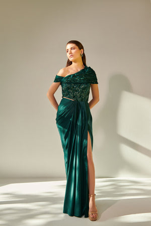 Off Shoulder Emerald Green Drape Gown With Waist Cut-Out