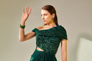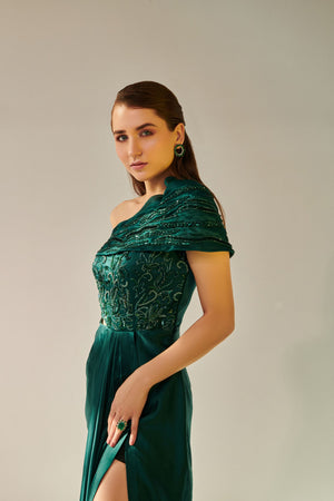 Off Shoulder Drape Gown With High Slit And Pleated Drape On Shoulders Embellished With Katdana, Beads And Variety Of Sequences In Hues Of Green. Standard Gown Length Is 60 Inches