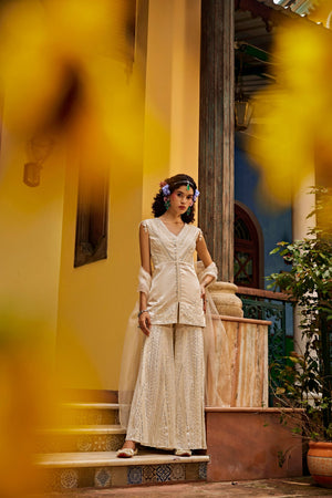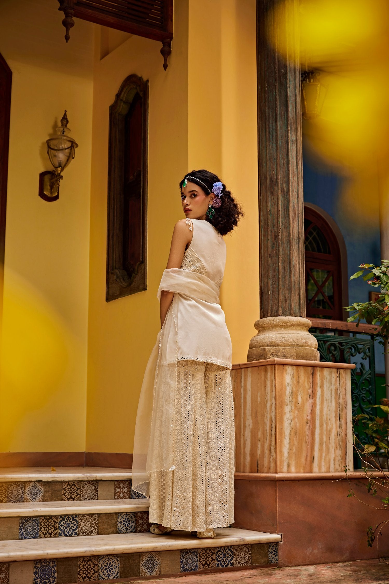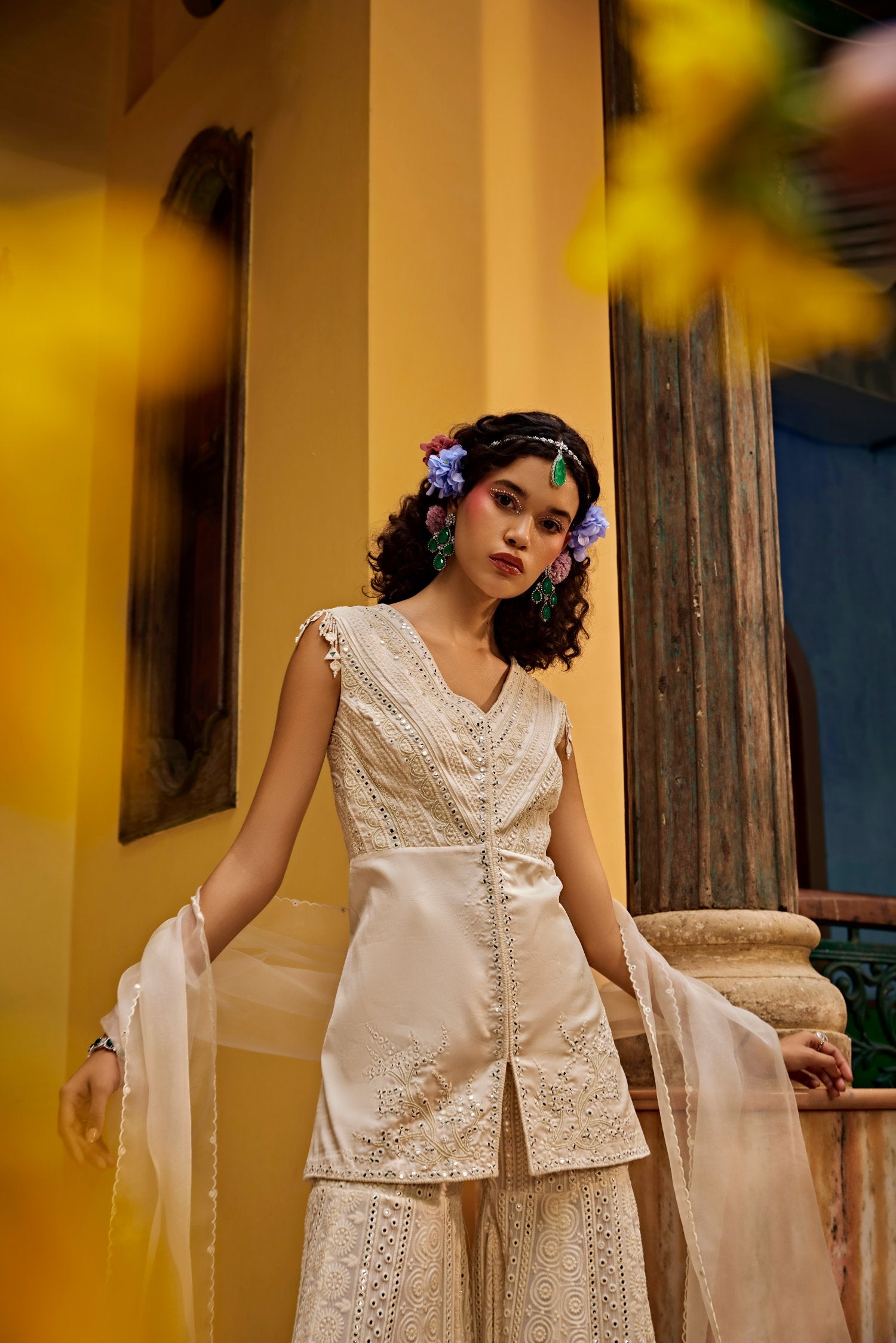 Experience sheer opulence in our off-white abla embroidered georgette sharara. Accompanied by a satin organza abla pearl and thread embroidered short sleeveless jacket, and adorned with an organza scalloped dupatta. This ensemble embodies luxury and is perfect for sophisticated celebrations, weddings, and upscale gatherings. Elevate your style with this exquisite combination, fusing tradition with modern elegance. Model Info: