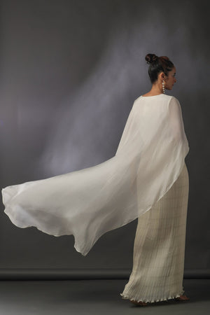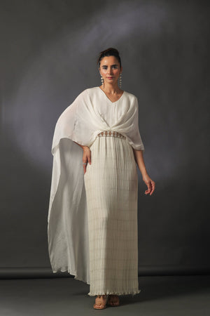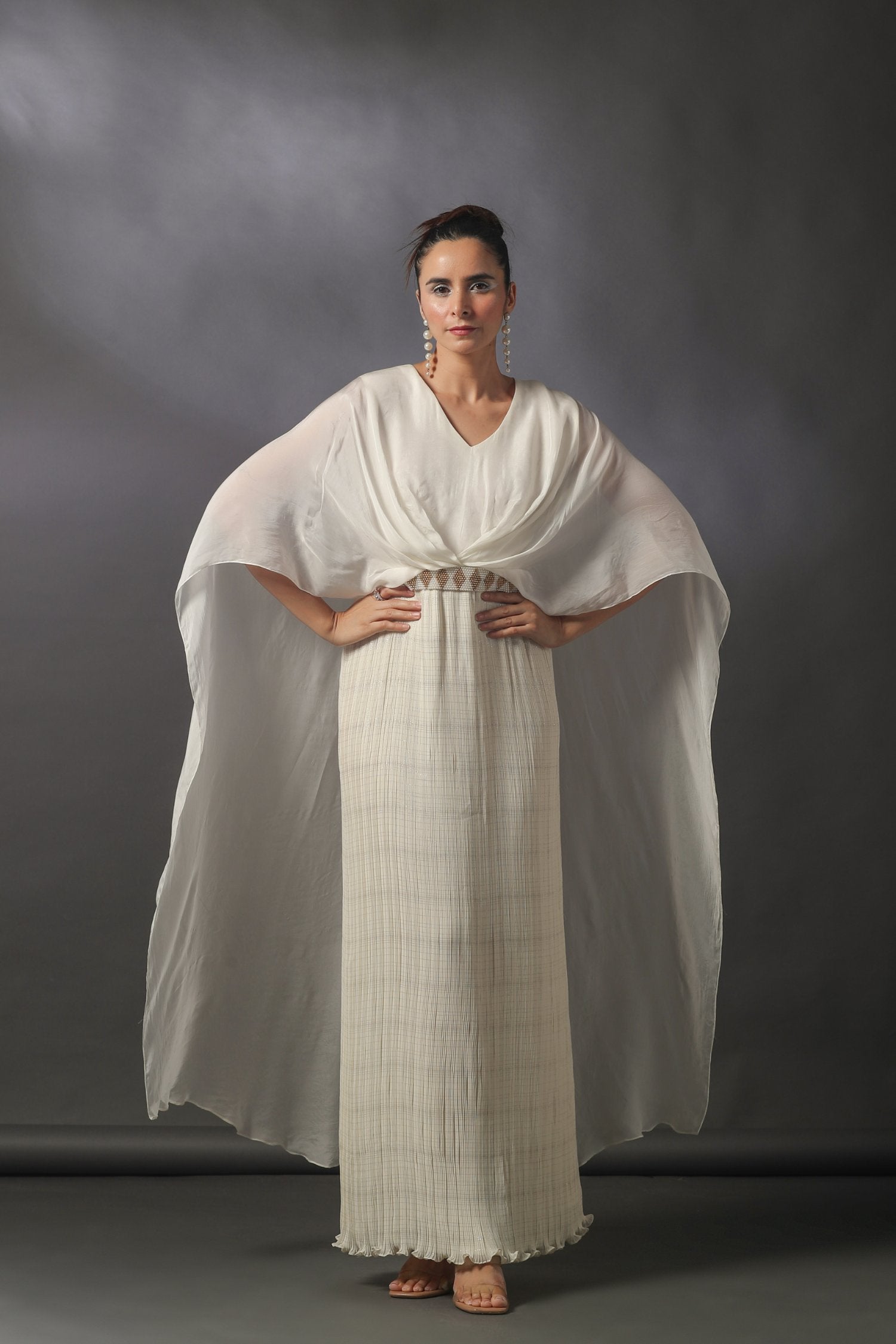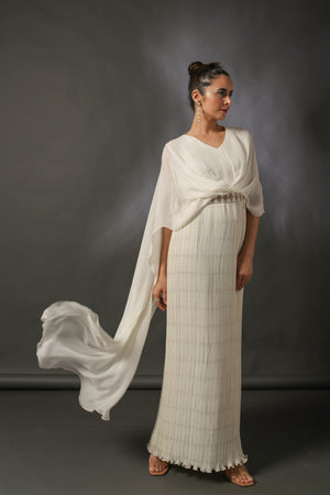 Featuring an off white gown with elongated cape pattern at the back and a pleated bottom. It has an attached pearl embroidered belt.