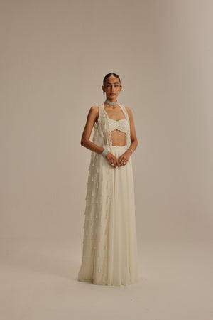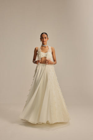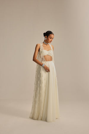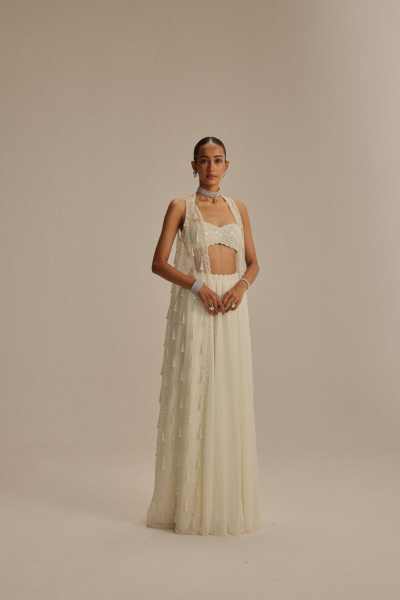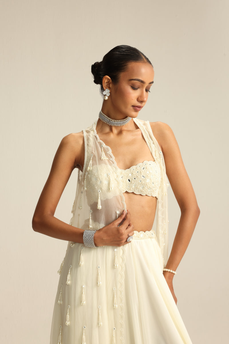 Off white Jacket set, adorned with mirror and pearl embroidery and cascading pearl tassels, paired with a heavily embroidered blouse and skirt.