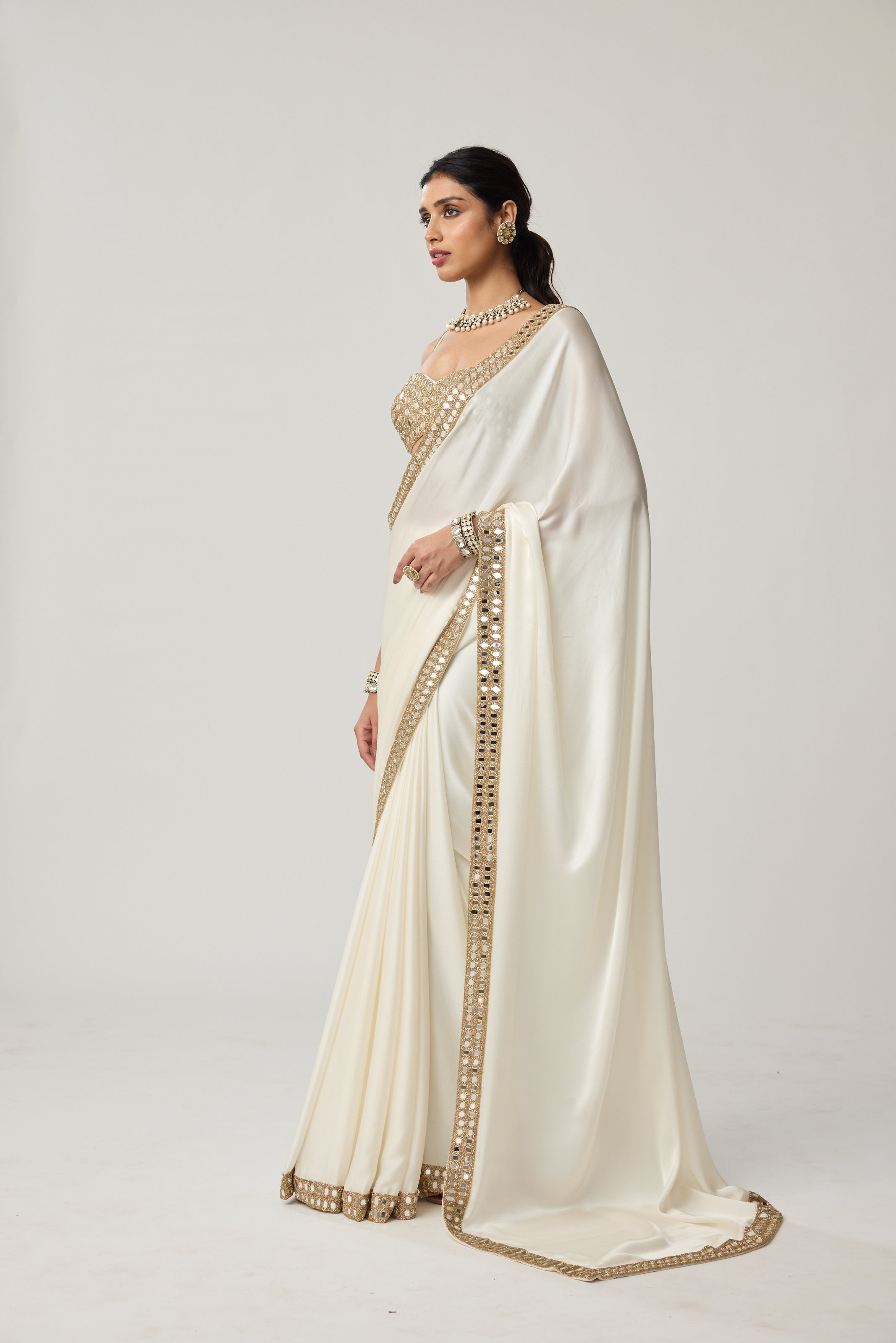 Off White Mirror hand embroidered Satin Saree clubbed with real hand cut mirror embroidered sleeveless blouse.