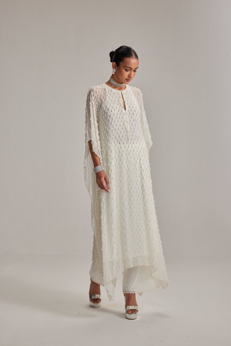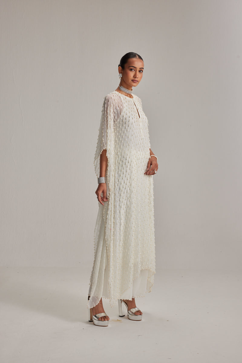 Off White Kaftan set with mirror and pearl embroidery, paired with a Georgette Pants. DISCLAIMER :- The colour might slightly vary from the images