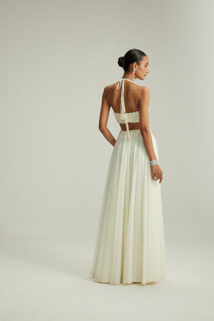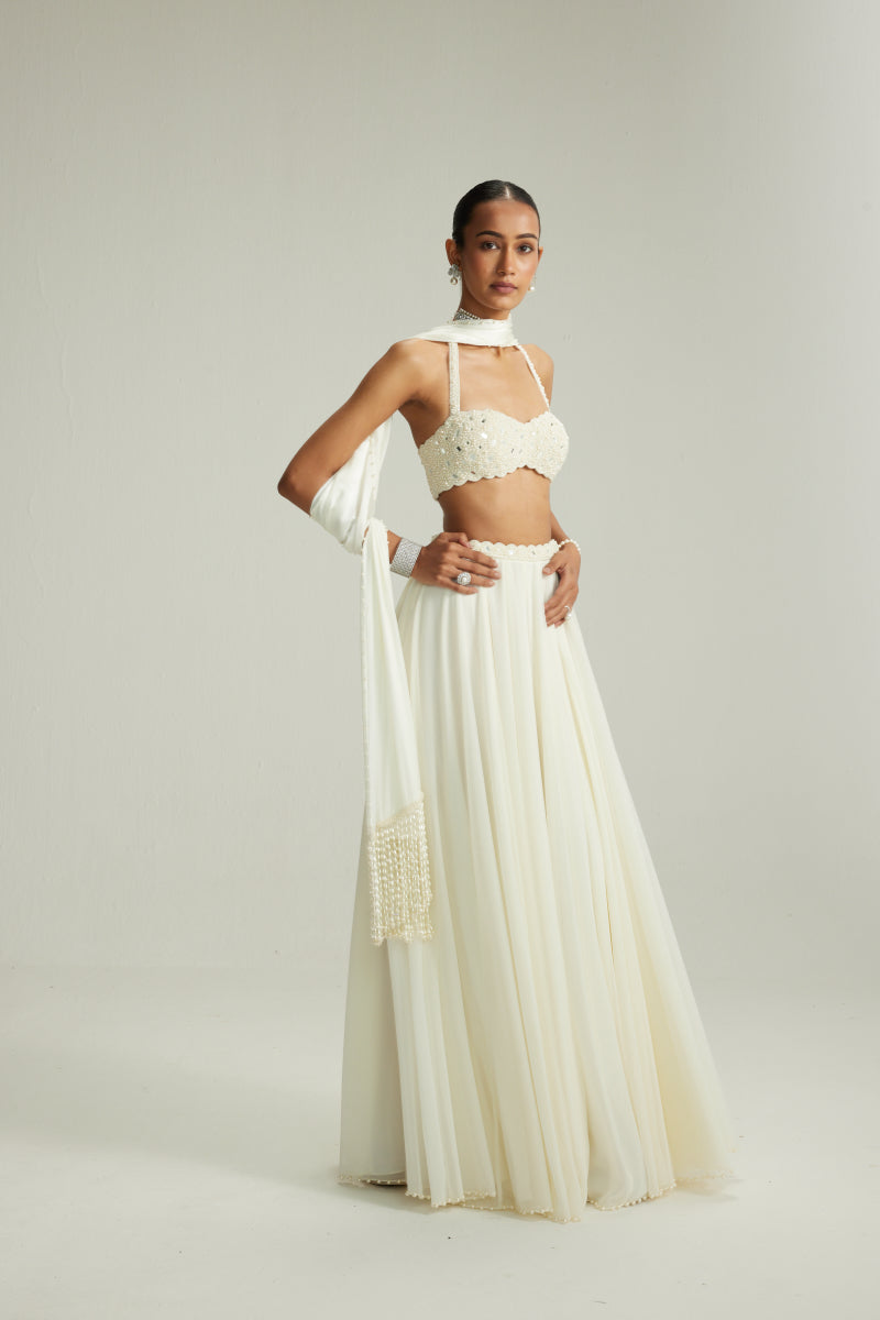 Off White Lehenga Pants Paired with mirror and pearl embroidered Halter Neck blouse and Dupatta With Cascading Pearl Tassels.