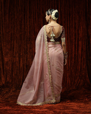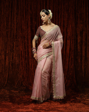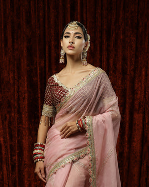 Thes is a beautiful Old Rose & Maroon organza saree with exquisite detailing of Badla and Kasab work and Hyderabadi micro pearls. This saree is paired with a Maroon blouse with rose gold gota, pearl and crystal drop detailing. This blouse beautifully complements the saree providing the outfit a classic look!