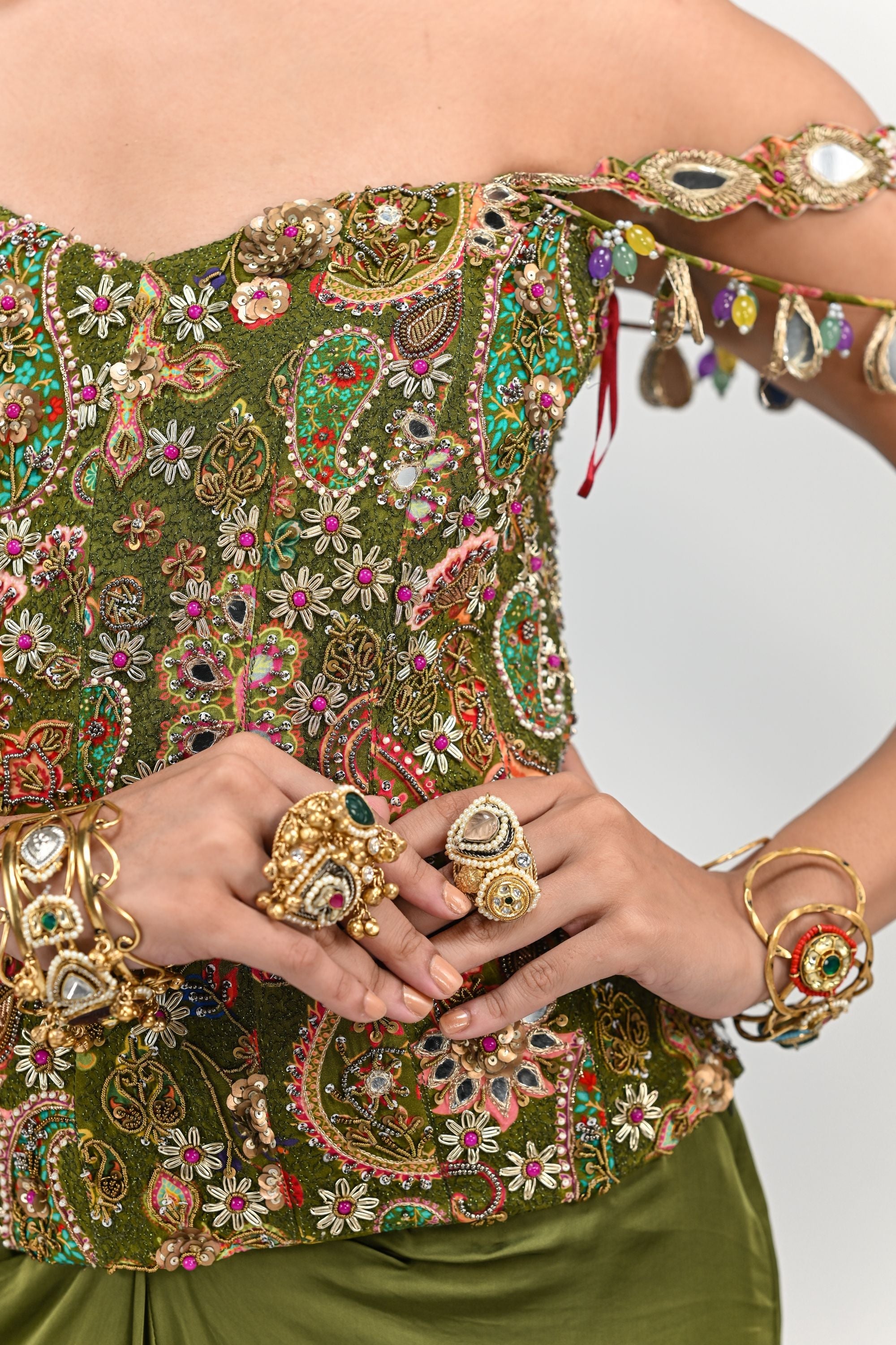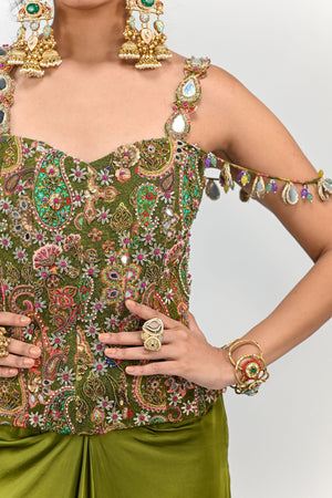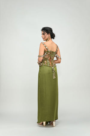 Olive Badla Embroidered Corset Paired With Olive Cowl Skirt