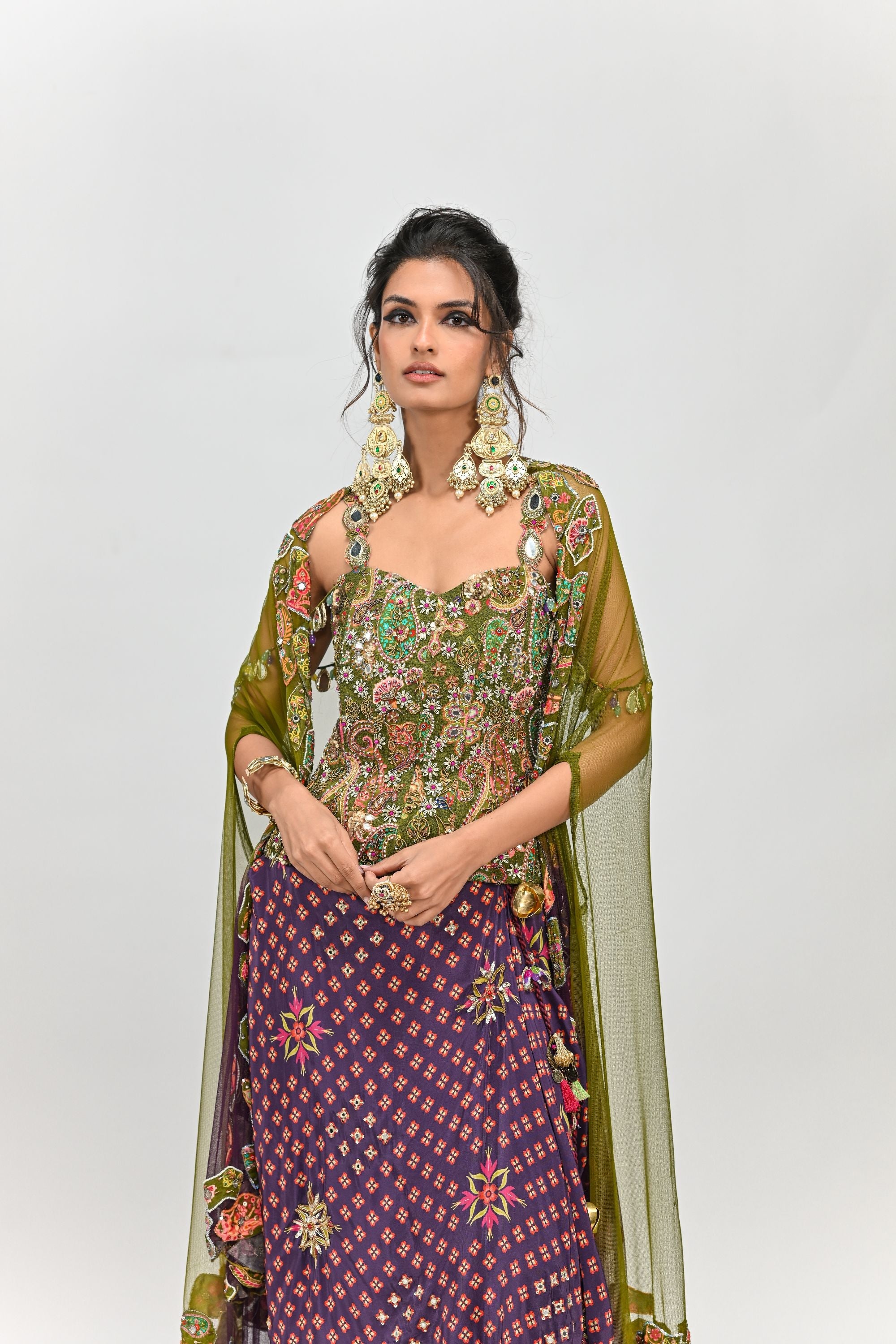 Olive Badla Embroidered Corset Paired With Embroidered Plum Dhoti Set And Ombre Applique Cape