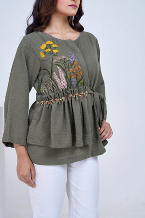 A cinched peplum top in an earthy olive tone, featuring hand-painted wildflower blooms and an adjustable tie-up waist. The flared silhouette with soft bell sleeves offers both comfort and shape, making it an effortless pick for work or weekends. Color :- Olive