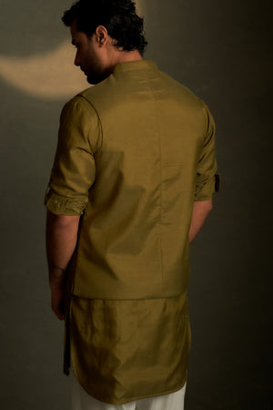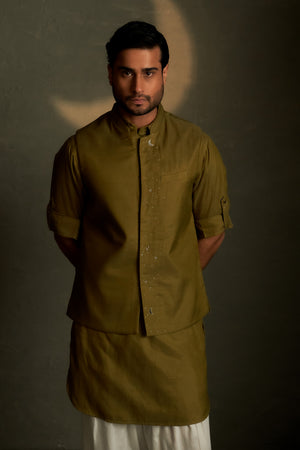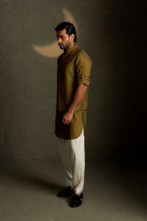 This men’s Pathani kurta is designed in a relaxed silhouette, featuring subtle star motif and glass crescent moon embroidery on the placket and sleeve cuffs, giving the impression of elegant cufflinks, with the same detailing on the inner sleeve loops for a refined touch. It is paired with a classic salwar and layered with a Nehru jacket showcasing matching embroidery along the front panel at the center placket placement. Together, the set creates a festive look that is both traditional and distinctive.
