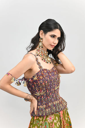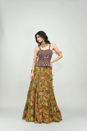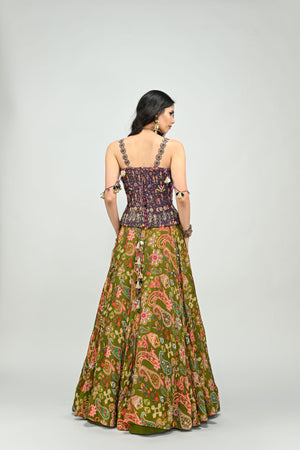 Olive Highlighted Lehenga Paired With Plum Embroidered Badla Corset