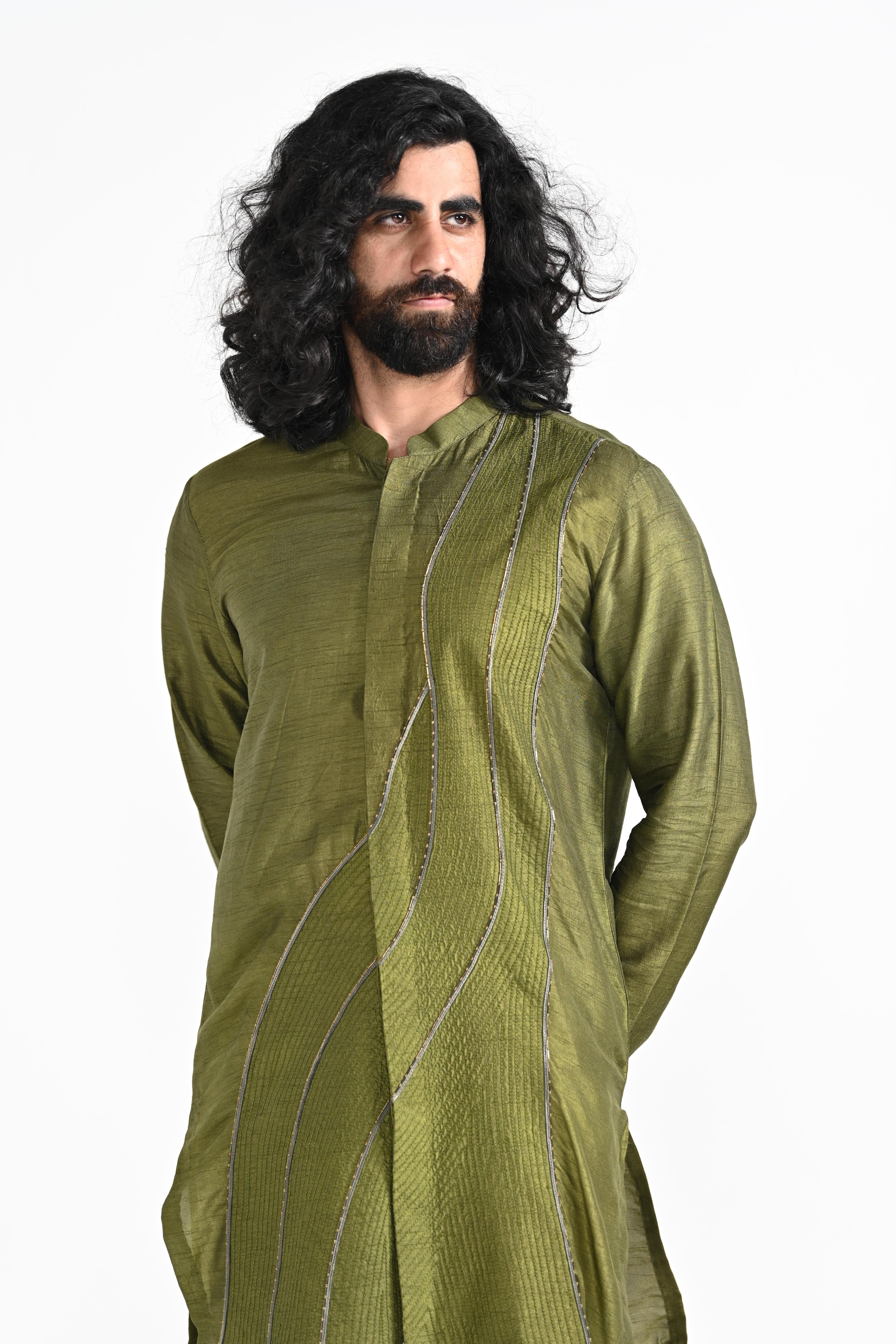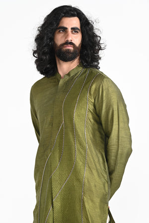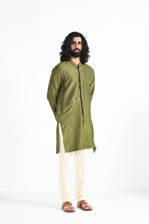 olive hand embroidered and stitchline deatailing work on bamberg raw silk.Paired with Buttercream slim fit Pant Pajama. Color of the actual garment may vary due to lighting conditions during the shoot .