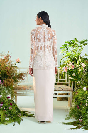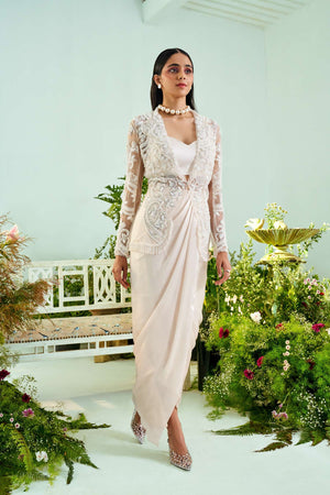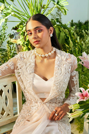 This set includes pearl & zardosi embroidered jacket paired with satin bustier & drape skirt. Ecru pearl embroidered drape skirt , bustier & jacket set