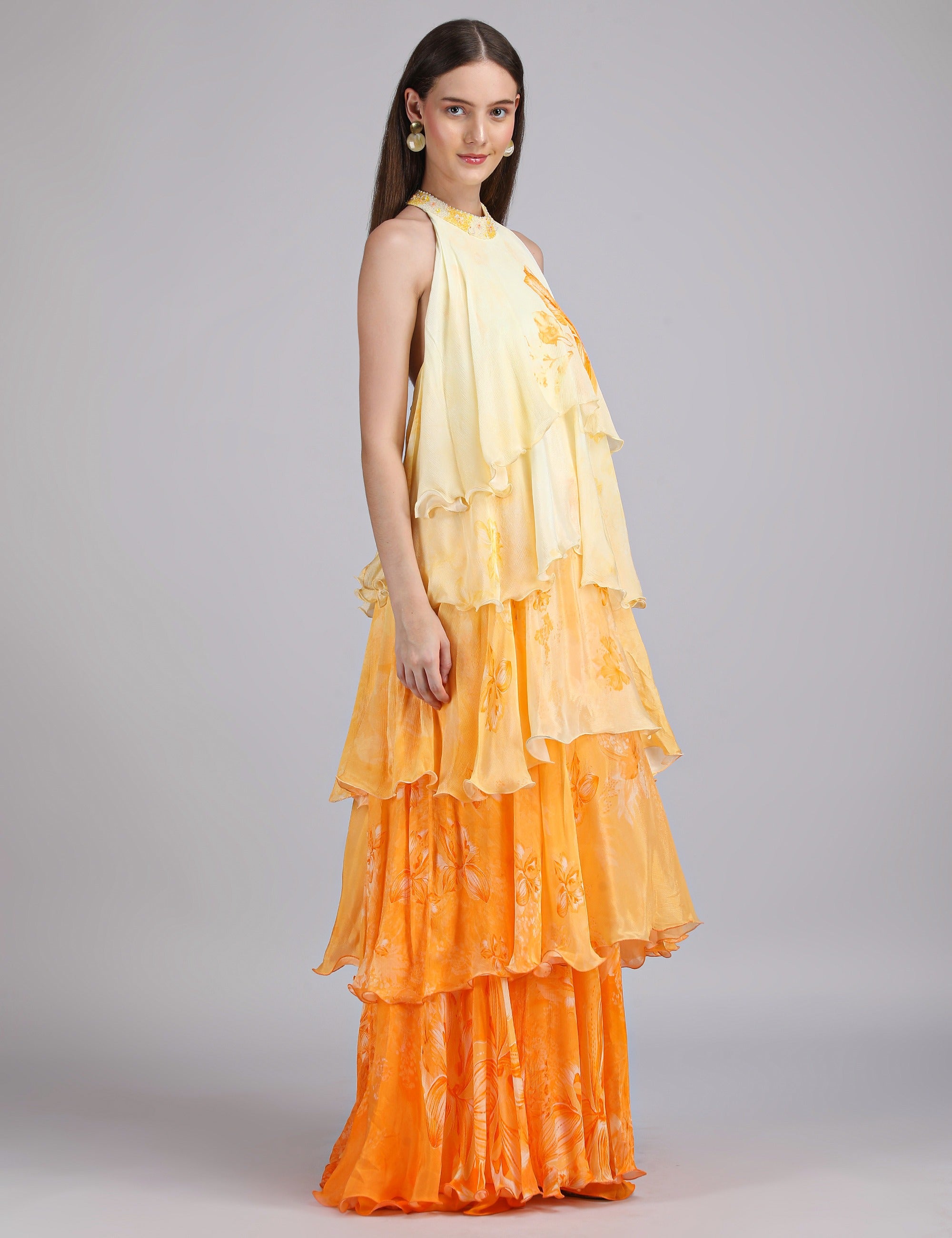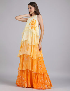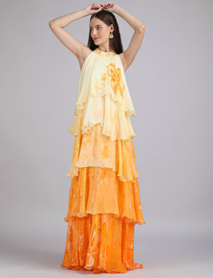 Stand out in this Ombre Herbs Flora Haze five-layered dress, featuring delicate embroidery on the collar and a backless, sleeveless silhouette. A fluid statement piece designed for elevated resort evenings.
