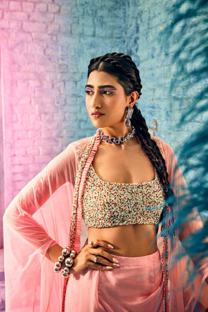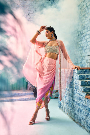 Bustier Fabric:Crepe,Skirt Fabric:Crepe,Cape Fabric: Strechable Net,Embroidery: Sequins work