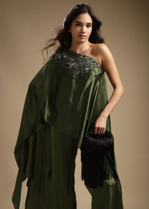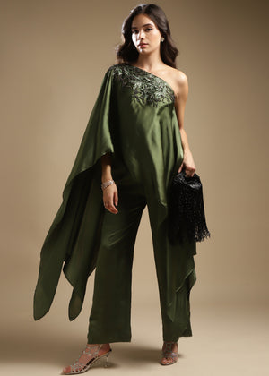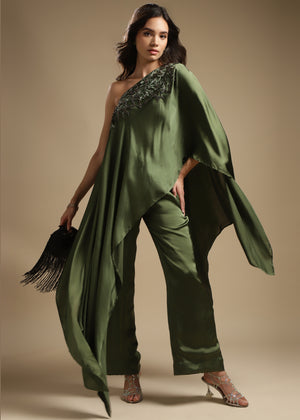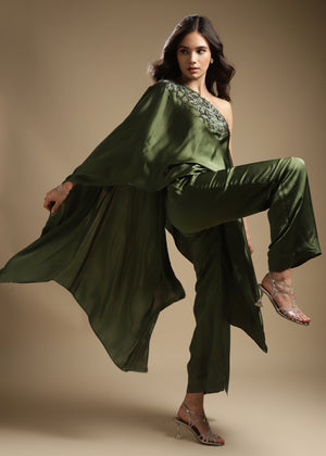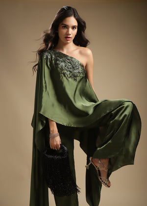 One-Shoulder Assymetric Top With Embroidery Detailing On The Front. Paired With Straight Pants.
