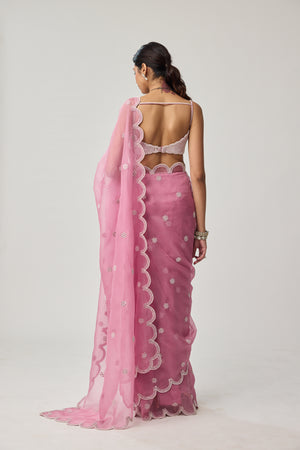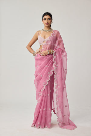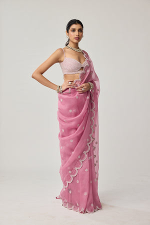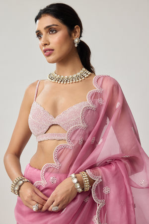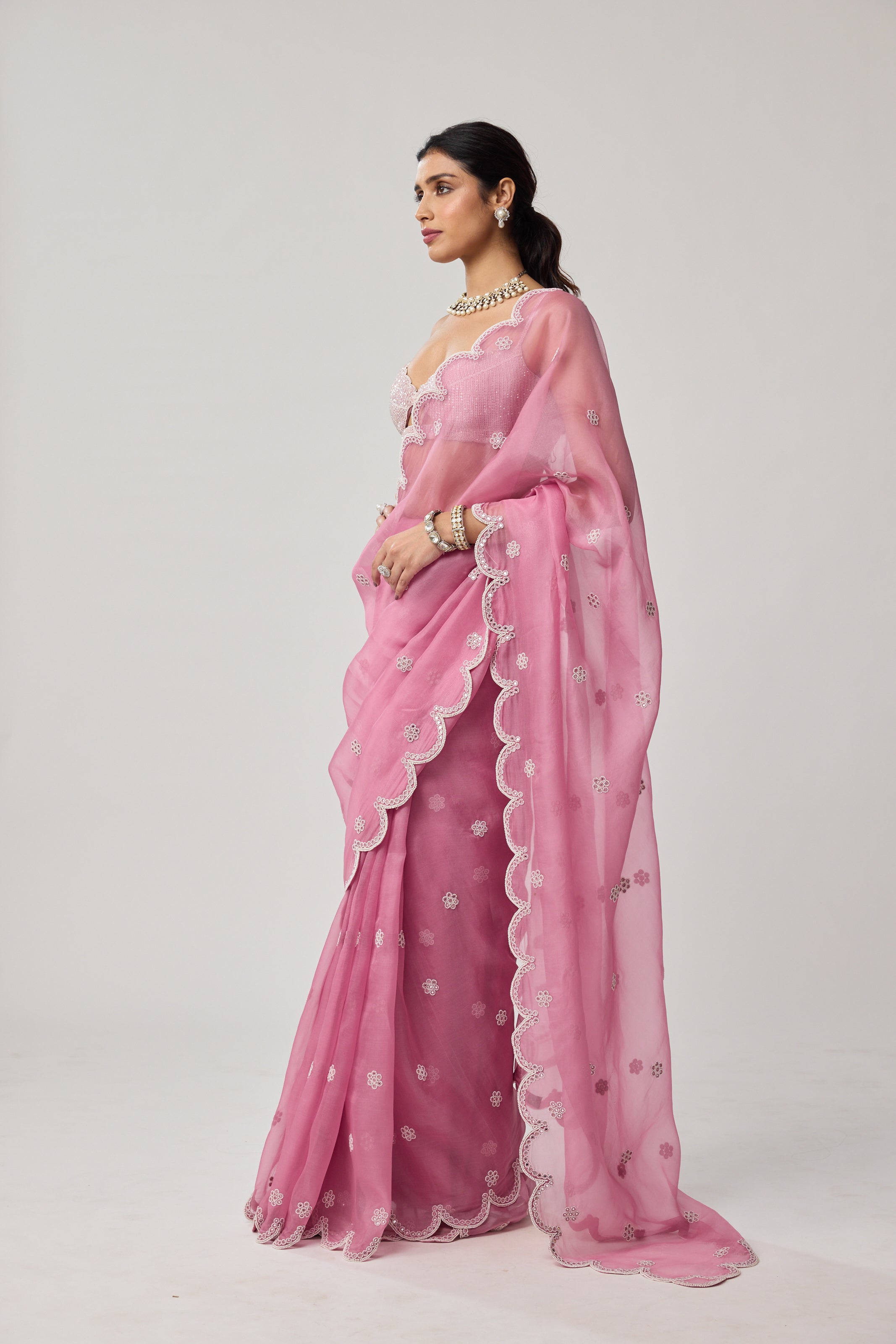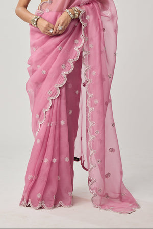 Onion Pink Organza saree set, adorned with mirror and pearl embroidery, paired with a heavily embroidered blouse.