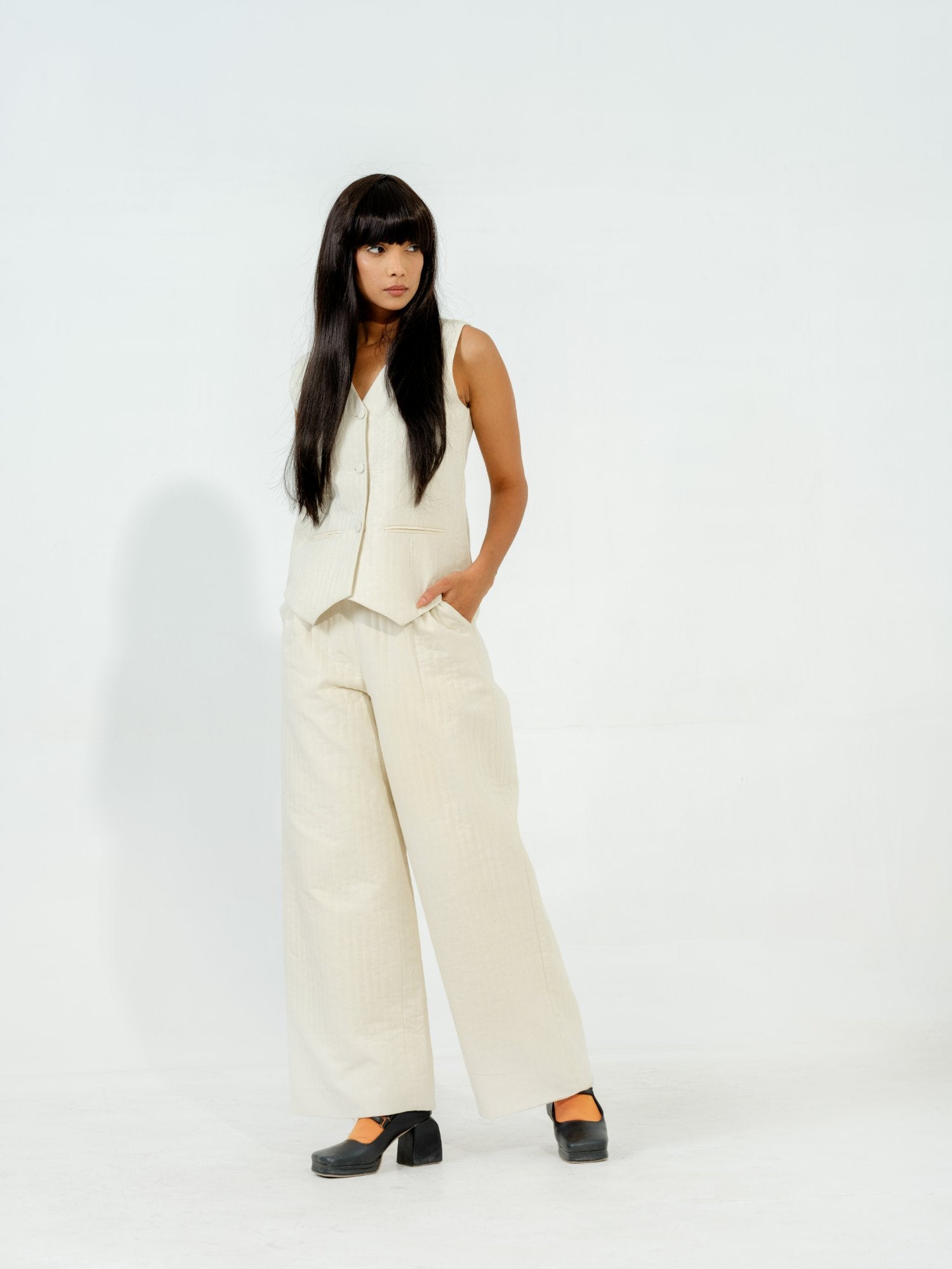 Elongated pants in hand sewn quilted fabric with side zipper