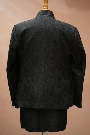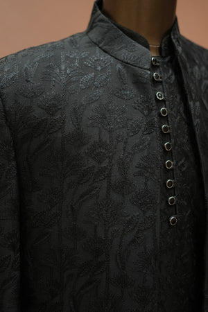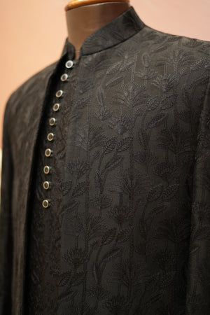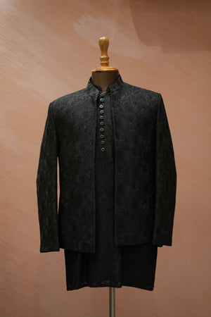 Featuring a black jacket with hand embroidery. It is paired with black trousers. Perfect wear for a wedding or sangeet ceremony, exuding traditional charm and elegance.