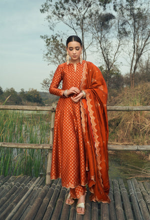 Introducing the Elaya Anarkali - a playful take on the classic anarkali dress! Made with luxurious vegan silk, this burnt orange woven anarkali has ruuning booti design with matching pants paired with complimenting dupatta and scalloped edges which is perfect for those seeking both style and sustainability. Stand out from the crowd with this quirky and fun addition to your wardrobe.