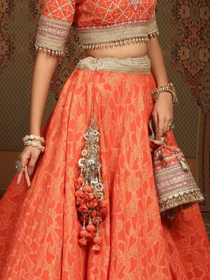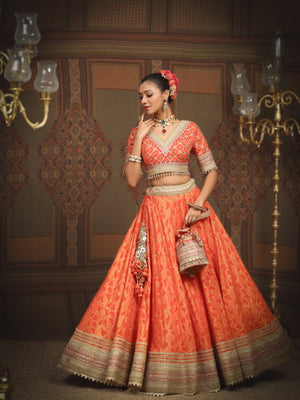 Embark on a journey of bold elegance with our Orange and Rani pink cotton Shimmer Chanderi lehenga. Adorned with intricate Gota, Dori and Badla work, this ensemble is a harmonious blend of traditional charm and contemporary. A delicate net dupatta gracefully accompanies the lehenga, adding a touch of ethereal beauty. The silk chandrri blouse features a chic V neckline. The dynamic interplay of orange and rani pink creates a symphony of passion and vibrancy, reflecting captivating presence.