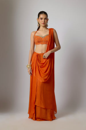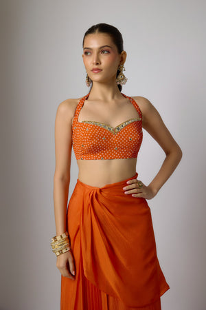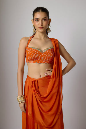 Featuring a vibrant Orange Draped Stitched Saree Set that exudes effortless festive glamour. The pre-stitched saree is crafted in fluid chinon, designed with elegant draping that enhances movement and flatters the silhouette. It is paired with a printed Bandhani chinon blouse, delicately highlighted with hand embroidery along the neckline for a refined finish. Accessorize it with statement earrings and heels for haldi ceremonies, sangeet celebrations, or wedding festivities.