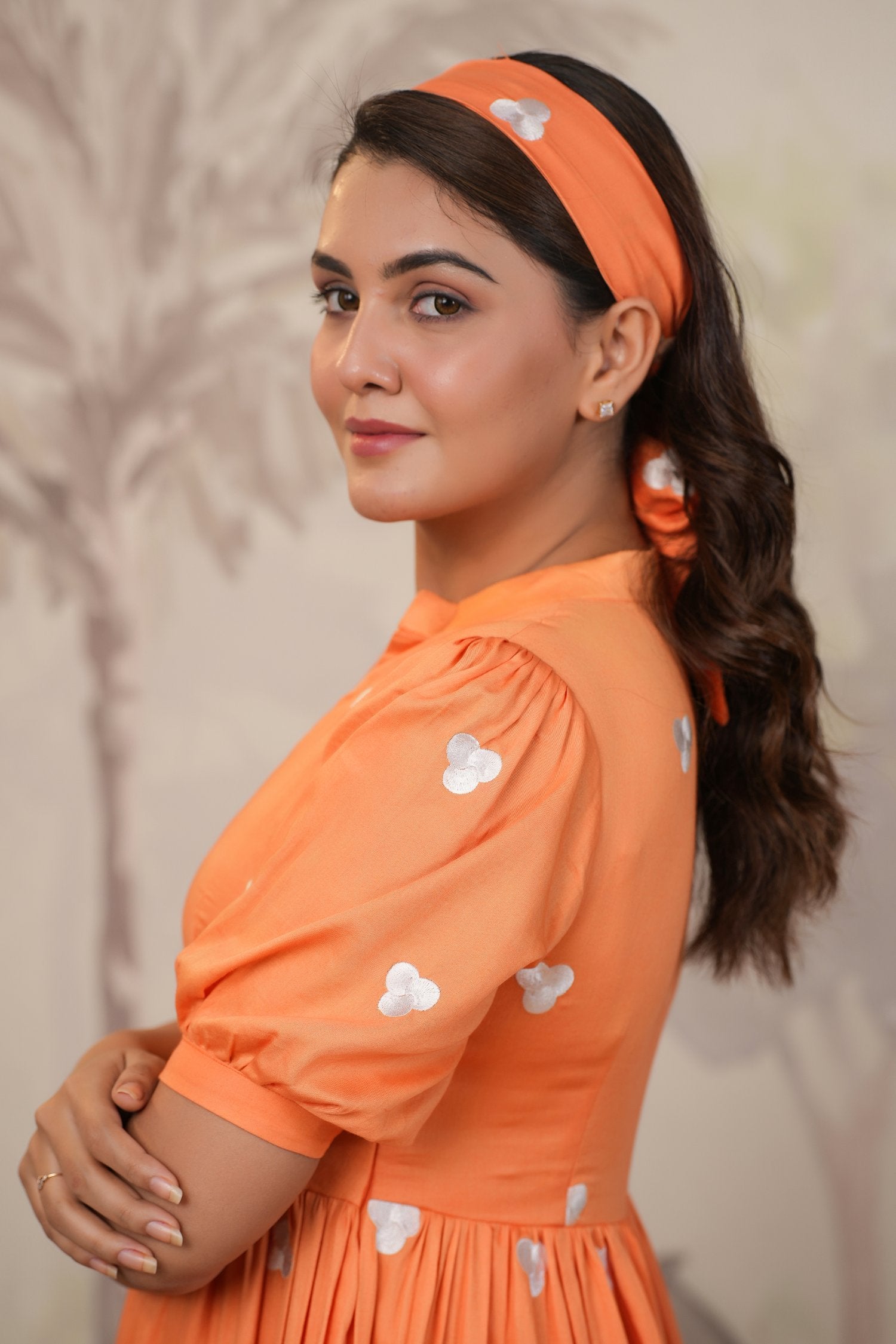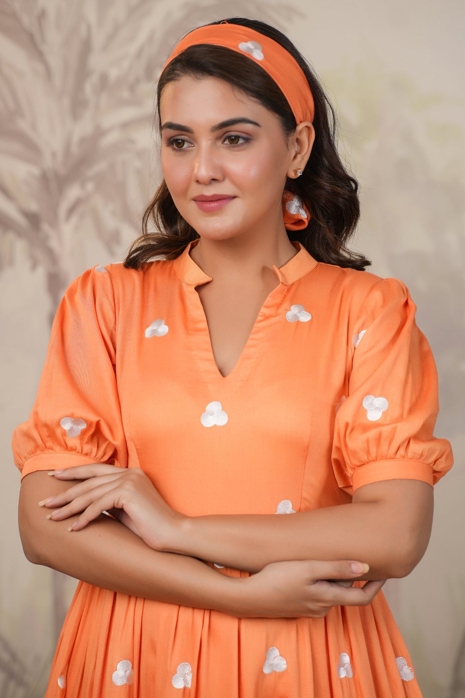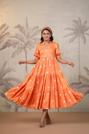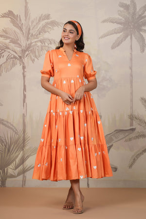 1. Orange Embroidered Long Full Flared Tired Dress .