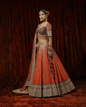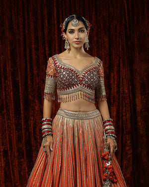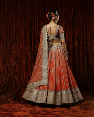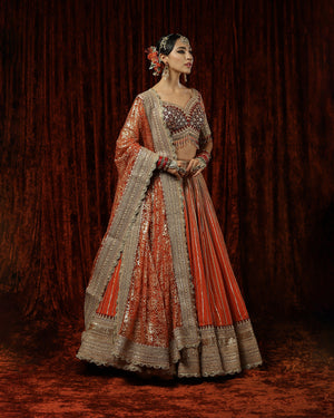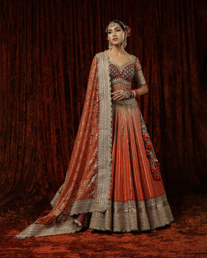 this Sunset Orange lehenga which emballished with fine gota, dori & badla embroidery. It is paired with maroon Silk Chanderi gota work blouse and net dupatta.