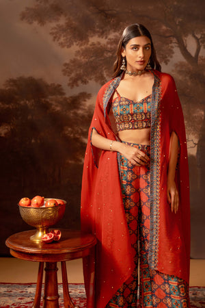 Red Orani Embroidered bustier and straight silk pants, paired with an asymmetric organza cape..