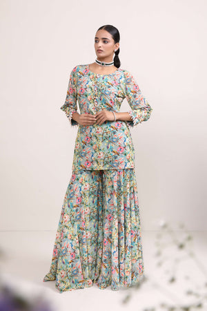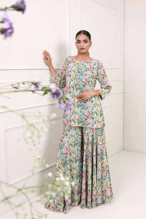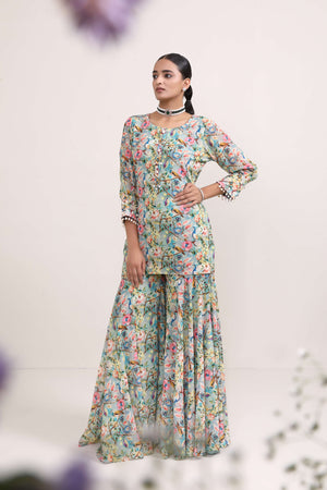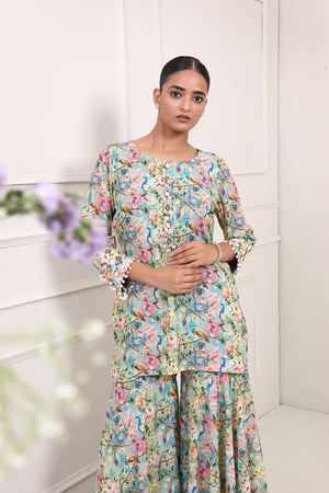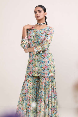 This printed sharara suit is adorned with exquisite peacock and floral motifs has charming and nature-inspired aesthetic. The delicate shell highlights add a subtle yet distinctive touch, enhancing the overall appeal. It combines the beauty of motifs with a unique and beachy twist, making it a truly eye-catching ensemble.