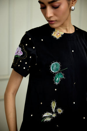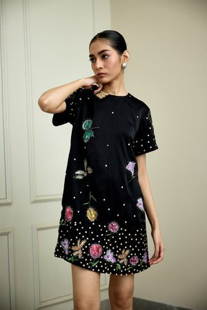 Elevate your wardrobe with the Oria Shift Dress, featuring an elegant black base adorned with delicate floral patterns. Intricately detailed with shimmering sequins and subtle beadwork, this dress combines timeless style with refined craftsmanship. Perfect for sophisticated occasions, its sleek silhouette offers a flattering, comfortable fit that transitions effortlessly from day to night.