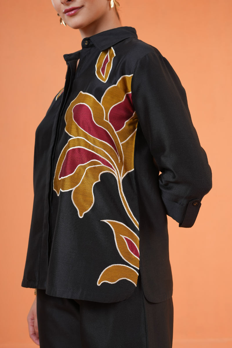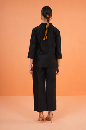 Black Chanderi Silk Co-ord Set with intricate Resham Embroidery and Appliqué work paired with coordinated Pants