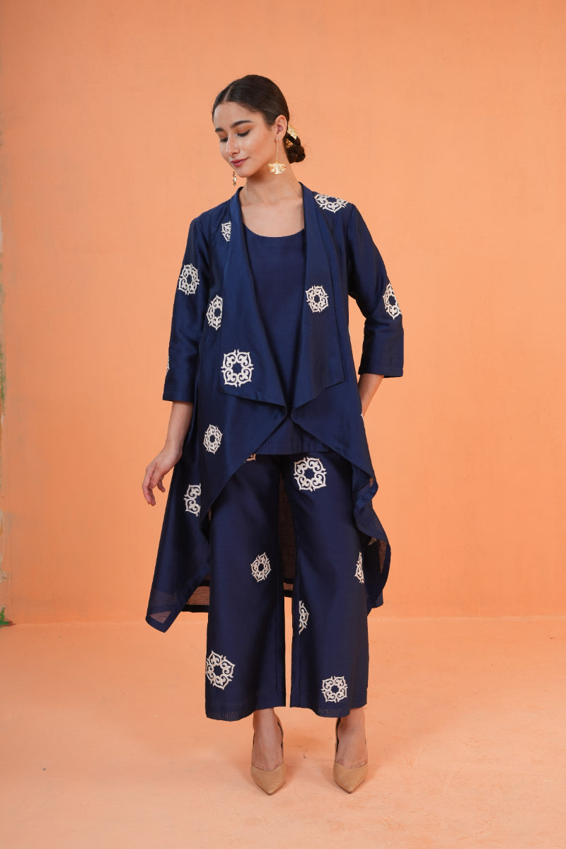 Blue Chanderi Silk 3 Pcs Set, featuring a Waterfall Resham Embroidered Jacket, a sleek sleeveless Inner Top, and tailored Pants