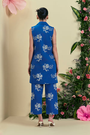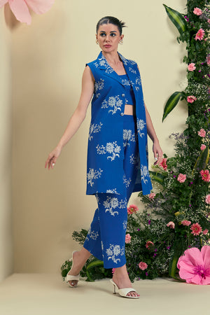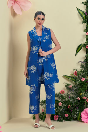 This elegant co- ord set features a sleeveless, all - over intricate embroidered notch-collar jacket paired with a coordinated bustier and tailored pants for a modern, refined silhouette. Designed to offer both comfort and confidence, it’s a perfect choice for when you want to feel effortlessly chic and put-together.
