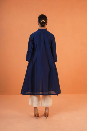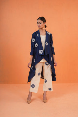Blue and Ivory Chanderi Silk 3 Pcs Set, featuring a Waterfall Resham Embroidered Jacket, a sleek sleeveless Inner Top, and tailored Pants
