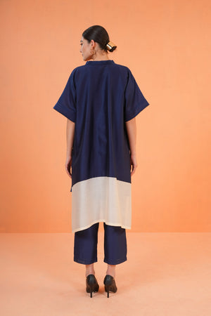 Blue and Ivory Chanderi Silk Kaftan-Styled Kurta Set, embellished with intricate appliqué and Resham Embroidery with coordinated Pants featuring appliqué detailing