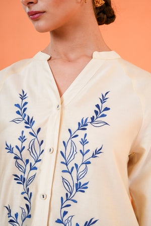 Ivory and Blue Chanderi Silk Co-ord Set highlighted with delicate Resham Thread Embroidery, paired with contrast Pants