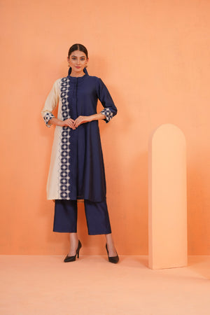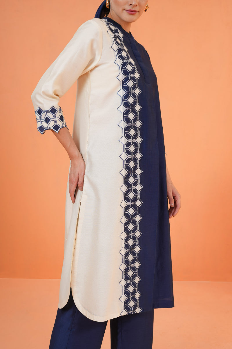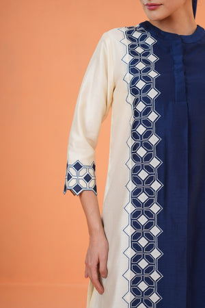 Blue and Ivory Chanderi Silk Kurta Set in Dual colour, with Resham embroidery and Intricate Applique and Cutwork and styled with Coordinated Pants