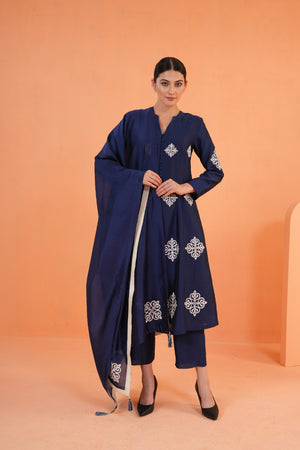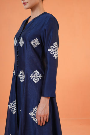 Blue Chanderi Silk Panelled Long Kurta Set, adorned with Intricate Resham embroidery and paired with Coordinated Pants