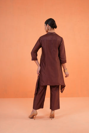Brown and Ivory Chanderi Silk Asymmetrical Tunic Set, adorned with contrast Appliqué and delicate Resham Embroidery, styled with Coordinated Pants