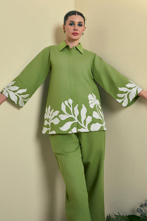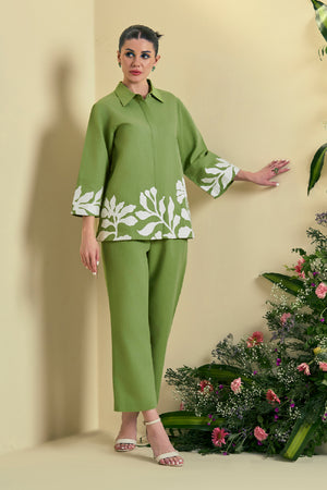 Chic and timeless, this green co-ord set combines comfort with elegance, featuring long flared sleeves adorned with intricate embroidery and chanderi silk appliqué work. Paired with easy-fit pants and a pocket, it's perfect for graceful, all-day wear.