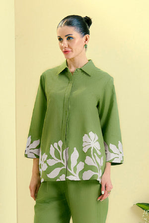Chic and timeless, this green shirt combines comfort with elegance, featuring long flared sleeves adorned with intricate embroidery and chanderi silk appliqué work.