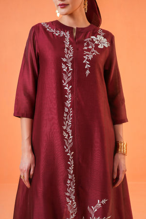 Maroon Asymmetrical Chanderi Silk Kurta Set with Intricate Resham Thread Embroidery, styled with coordinated Pants for graceful versatility
