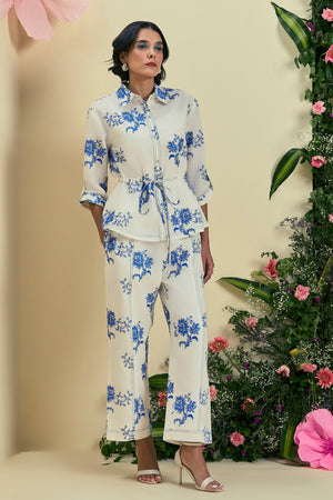 Chic and versatile,this Co - Ord Set showcases all-over embroidery with a waist drawstring that creates a subtle peplum effect. It includes a separate inner slip for added comfort and ease. Paired with fully lined embroidered pants featuring a utility pocket, both pieces are finished with contrast stitch detailing along the edges and seams for a sharp, modern look.