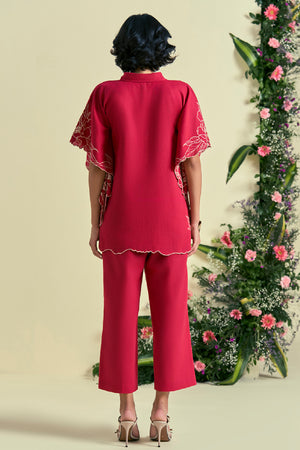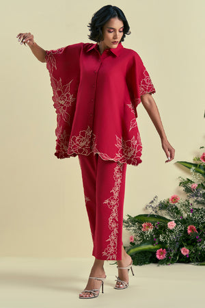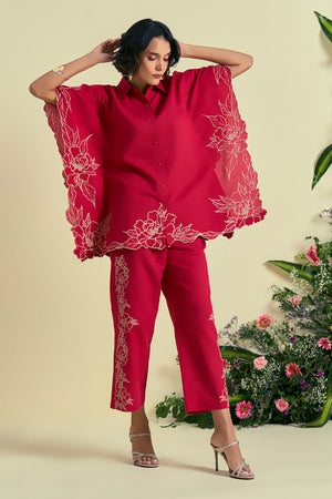 Striking and elegant, this kaftan style co -ord set features intricate embroidery and cutwork on all sides, complemented by a collar and concealed button placket. Paired with smart, tailored pants adorned with side seam embroidery and a functional pocket, this ensemble is the perfect choice for making a graceful and memorable statement wherever you go.